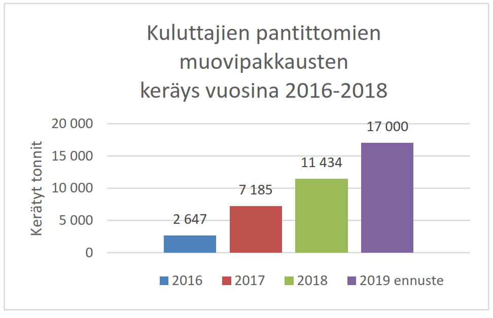 Kiinteistökeräys kasvoi vuonna 2018 yli 180 %, yrityspakkauksissa nousua oli 13 %. Suomessa kerättiin pantilliset pakkaukset mukaan lukien yli 40 000 tonnia muovipakkauksia, noin 30 % markkinoille tuoduista pakkauksista.