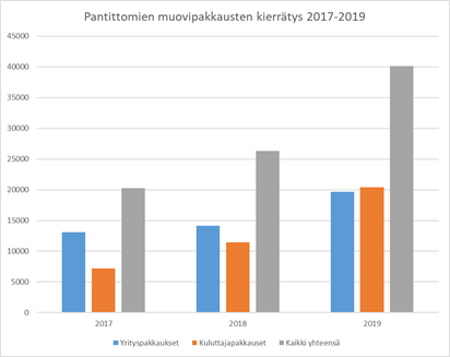 Muovipakkausten kierrätyksessä rikottiin ennätyksiä vuonna 2019. Yhteensä pantittomia muovipakkauksia kerätiin 40 264 tonnia. Kotitalouksien muovipakkauksia kerättiin 9 000 tonnia eli 79 % edellisvuotta enemmän.